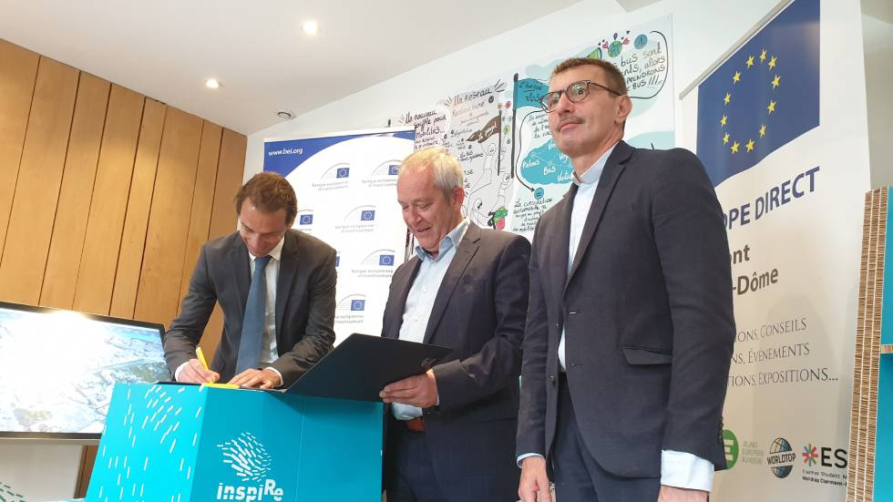 Sur les 325 millions d’euros que coûte le projet InspiRe, 90 sont prêtés par la BEI, Banque Européenne d’Investissement. Le dossier a été ouvert en 2019, mais la traditionnelle signature de convention n’avait pas encore eu lieu. Grégoire Chauvière Le Drian, chef du bureau du groupe BEI en France est venu cette semaine à Clermont accompagné de collaborateurs pour procéder à la signature des document officiels avec François Rage, président du SMTC. À deux semaines des élections européennes, il était intéressant de le questionner sur le fonctionnement de cette institution destinée à financer des projets portés par des collectivités ou des entreprises.