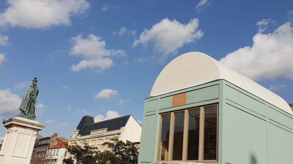 C’est une maison bleue accrochée à… la place de Jaude, à coté de la statue du Général Louis Charles Antoine Desaix. Petite maison, fabriquée en bois, montable en seulement 5 jours par 3 personnes, elle est nomade, car facilement démontable et transportable. Son nom : Proto-Habitat : elle est encore à ce jour à l’état de prototype, conçue lors de recherches de deux étudiants en architecture, Frédérique Barchelard et Flavien Menu alors qu’ils étaient en résidence à la Villa Medicis. Elle a été présentée pour la première fois à Bordeaux en 2020 au Jardin public.