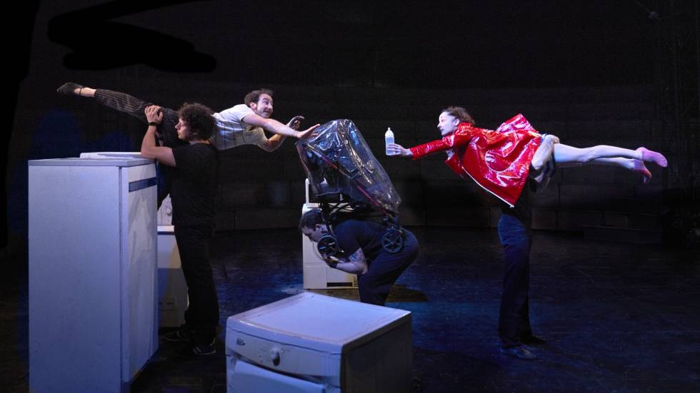Sur une scène pleine d’électroménager, un couple tente de rester soudé, pour le meilleur et pour le pire. Mais le scénario de la vie n’est pas toujours une ligne bien droite. Parfois, le four à micro-ondes ou le lave-linge deviennent des personnages à part entière, se glissant dans les interstices d’un quotidien évidemment imprévisible, se retrouvant en lévitation, jouant les trouble-fêtes survoltés dans l’harmonie des amoureux qui se retrouvent parfois pour des câlins à deux mètres du sol. Cette comédie humaine et technologique est portée par une bande son énergique, jouée en live par quatre musiciens dans la plus pure tradition du cirque.