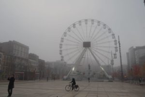 De rares passants, un pigeon, un brouillard opaque et, en arrière-plan, la grande roue et la statue du général Desaix. Il était tôt, ce matin-là, lorsque Patrick Bossin a photographié la place de Jaude.