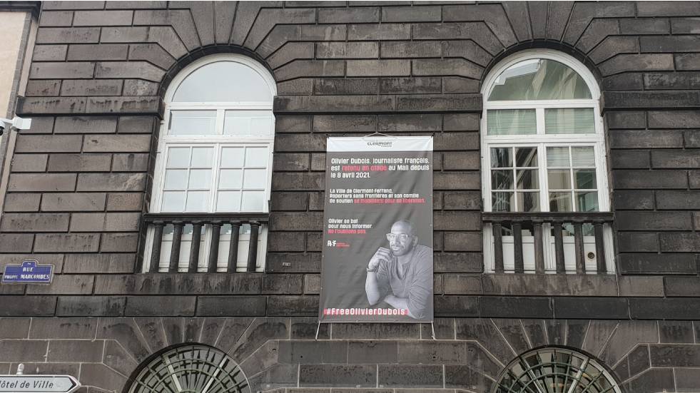 A l’occasion des 10 mois de captivité d’Olivier Dubois, la Ville de Clermont s’est associé RSF en déployant une bannière de soutien à son effigie sur le fronton de l’Hôtel de Ville. A propos de cette bannière, le maire, Olivier Bianchi précise : “RSF peut compter sur le soutien de la Ville de Clermont-Ferrand quand il s’agit de défendre la liberté de la presse. Nous n’acceptons pas qu’Olivier Dubois soit retenu en otage. Sa libération doit être une priorité. Cette bannière affichée sur la mairie est là pour rappeler qu’on ne l’oublie pas et que la liberté d’informer est un socle inaltérable de notre démocratie ».