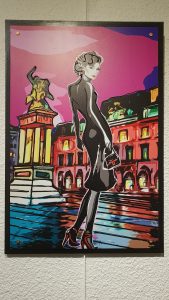 Candide Morcillo est originaire du sud de la France, sur les bords de la Méditerranée. Arrivée il y a une dizaine d’années en Auvergne, elle a immédiatement été séduite par l’ambiance clermontoise et la beauté des paysages alentours. Cette attirance se traduit aujourd’hui par une production graphique, hyper colorée, inspirée par deux grands thèmes : Les sites emblématiques, ceux que les touristes viennent découvrir en priorité, et Clermont intra-muros. Formée, à l’origine, en stylisme-modélisme, elle place fréquemment des “élégantes clermontoises” dans ses œuvres partant du principe qu’il n’y a pas de raison que l’univers de la mode prenne toujours Paris comme décors. Pour ces tableaux, Candide Morcillo utilise un support toile sur châssis ou plaque d’aluminium et peint avec une technique à base d’acrylique pour une étonnante “finition miroir”. La couleur n’en est que plus éclatante et permet de tordre définitivement le cou du cliché “Clermont ville noire”.