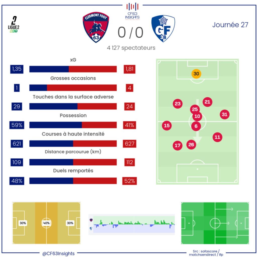 Opposés à une équipe grenobloise jouant sans véritable enjeu en cette fin de saison, les Clermontois ont proposé un contenu légèrement plus intéressant que lors de leurs dernières sorties, mais cela n’a pas suffi pour forcer la décision (0-0) et empêcher un douzième match cette saison sans marquer qui laisse toujours planer le doute sur la capacité de l’équipe à s’extirper d’une zone rouge qui lui semble promise.