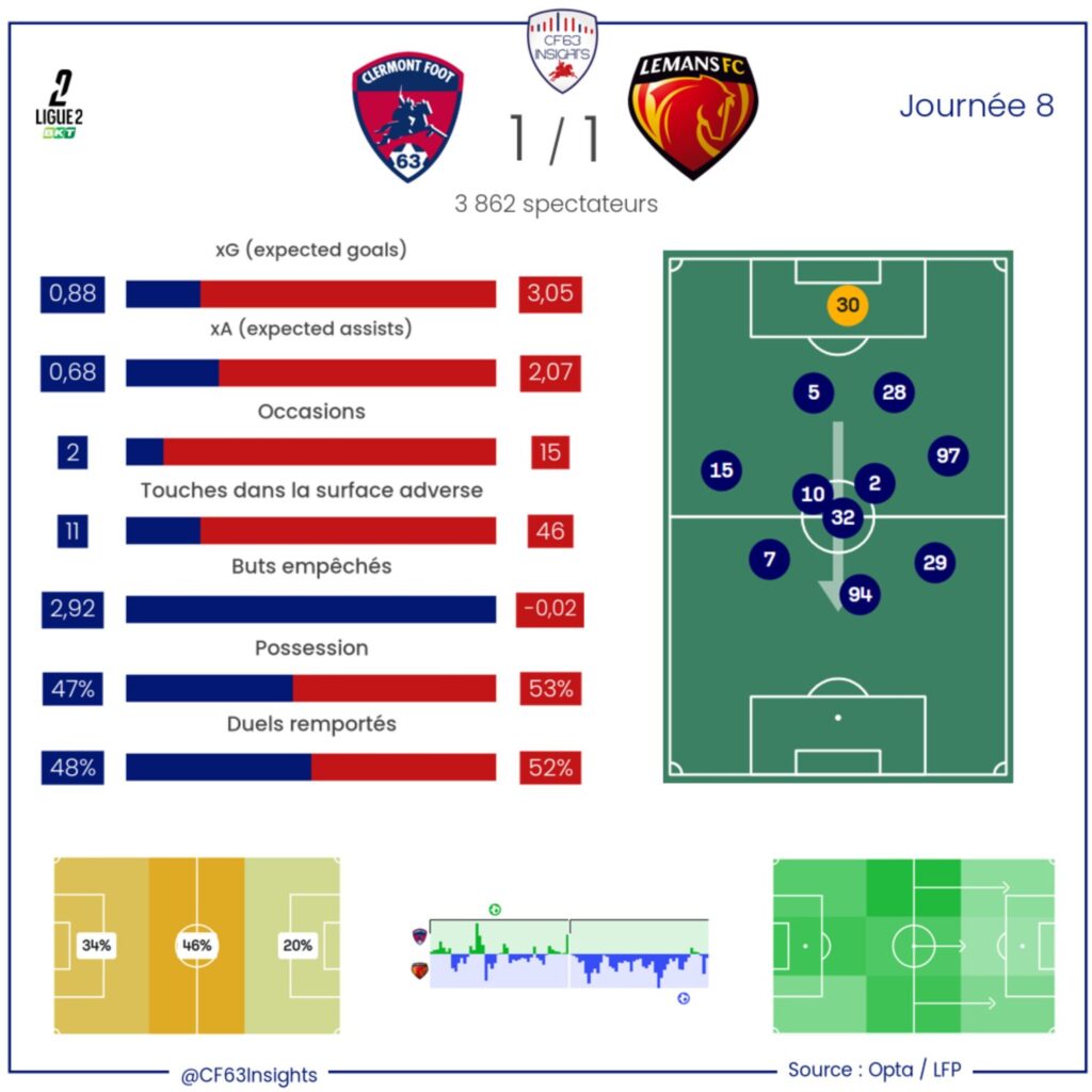 La possession penche clairement en faveur du Mans (53% au final), tout comme les xG (3.05 contre 0.88) et les touches dans la surface (46 à 11). Et que dire des occasions… 15 pour Le Mans et 2 (!) pour Clermont.