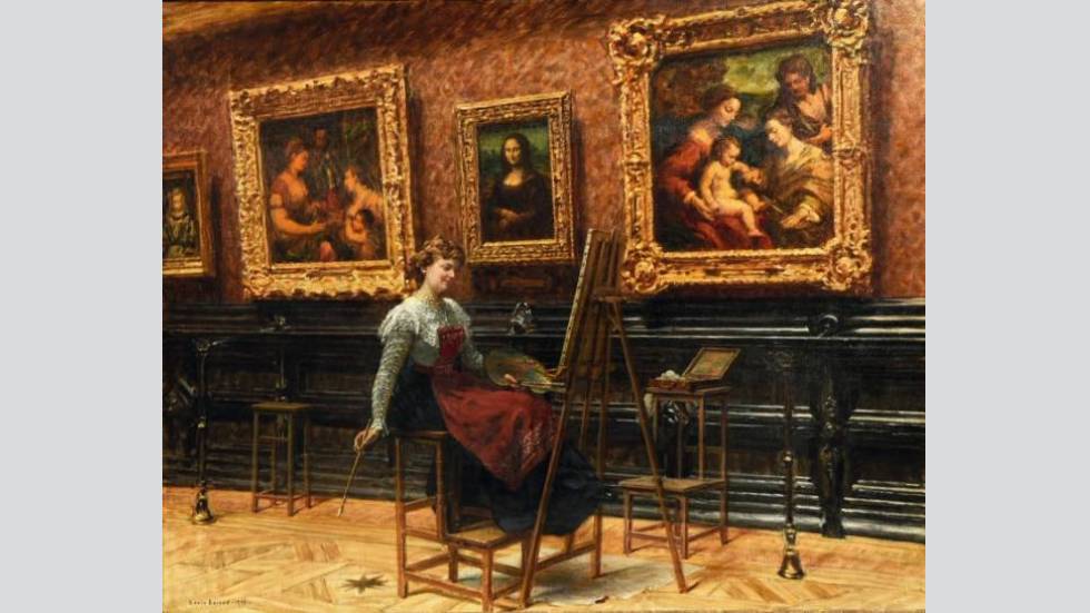 À partir de 1883, l’un de ses sujets de prédilection devient les copistes du musée Louvre. En 1909, il réalise ce tableau que les commissaires priseur clermontois ont découvert dans le patrimoine d’une famille auvergnate et mettent en vente à l’occasion de l’Ivoire Live Tour.