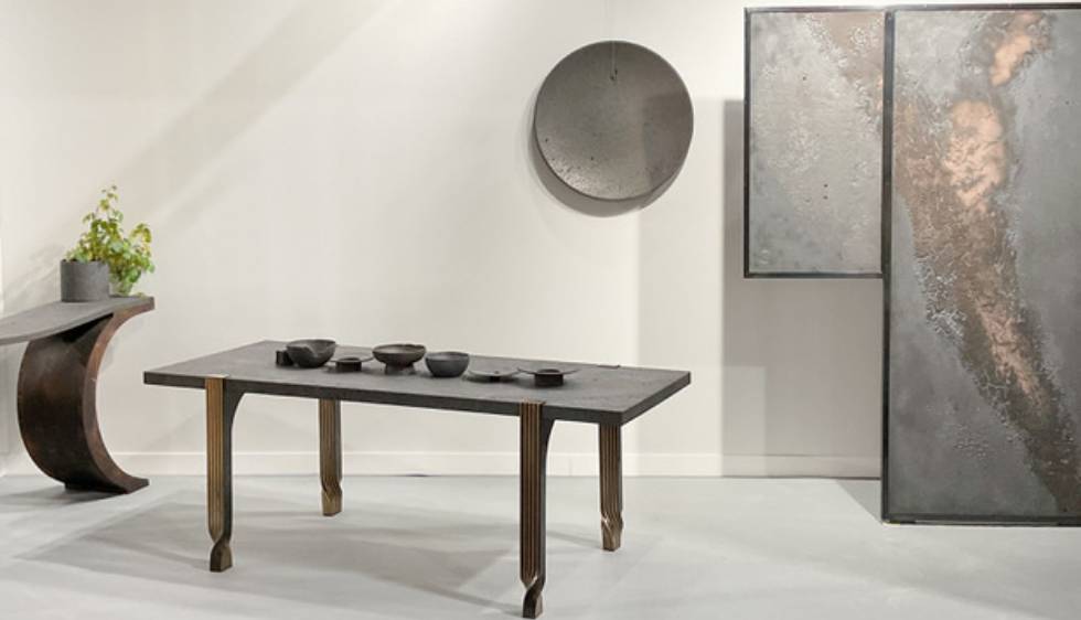 Devenu réalité, le bureau Echo est remarquable par le mélange de la lave et du métal. Chaque pied, d’un poids unitaire de 27 kg, est composé d’un empilement de laiton et d’acier, liaison inhabituelle pour ces matériaux initialement opposés. Pour donner l’aspect design à cet alliage, les pieds, dont l’embase a été torsadée d’un quart de tour, ont été patinés avec des nuances de bronze et de « canon de fusil » afin de trouver le meilleur accord avec le plateau en lave sombre de Céline Martinant. La réalisation de la seule partie métal du projet a nécessité 180 heures de travail.