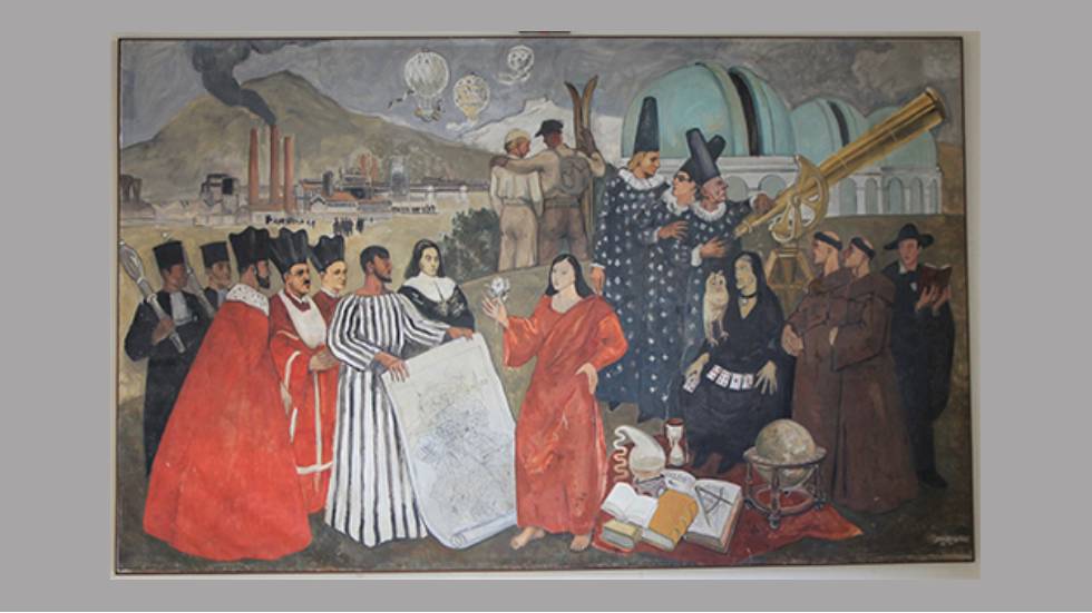 5 mètres de large, 3 mètres de haut, les dimensions d’Évocation des savants d’autrefois sont quelque peu hors norme. C’est pour décorer la Faculté des Sciences et des Lettres de Clermont-Ferrand, que l’État a commandé ce tableau en 1937 à Yves Brayer qu’il ne faut confondre avec son frère Alain Brayer qui fut le professeur de nombreux élèves de l’école des Beaux-Arts de Clermont. A cette époque, le gouvernement du Front Populaire souhaitait soutenir la création en consacrant 1,5 % des crédits alloués pour la construction des établissements d’enseignement supérieur et d’enseignement technique à des travaux artistiques. Le tableau est caractéristique de l’image de la modernité heureuse et optimiste telle qu’on la fantasmait dans les années 30. Elle foisonne de portraits symboliques et d’allégories, portés par les savoirs et les recherches scientifiques, l’industrie et le développement touristique. Le temps passa à l’Université et ce tableau, pourtant de bonne taille, disparu au grès des évolutions du bâtiment et tomba dans l’oubli. En 2018 il fut redécouvert à l’occasion de travaux sur le site historique de l’avenue Carnot.