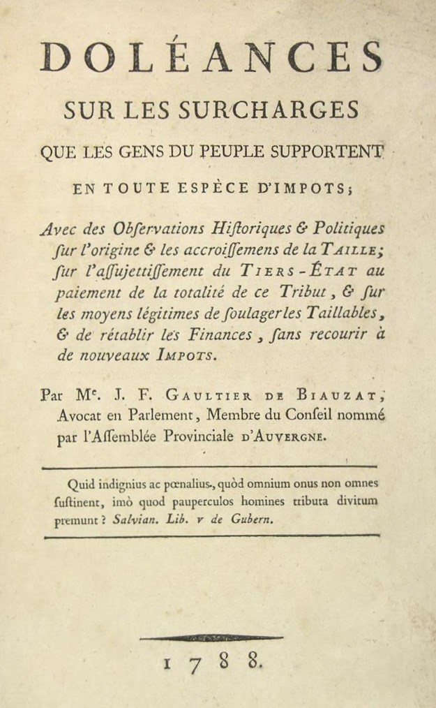 Membre élu, en 1787, de l’assemblée provinciale, il publie, l’année suivante, Doléances sur les surcharges que les gens du peuple supportent en toute espèce d’impôts. L’ouvrage fait le tour de l’Auvergne, attire vers son auteur nombre de communautés rurales en quête d’aide pour rédiger leurs cahiers de doléances et, après des démarches obstinées, est présenté à la cour le 15 janvier 1789.Deux mois plus tard, le voici, ainsi que le discret maire de Billom, Huguet, désigné député aux États généraux, réunis à Versailles par Louis XVI à partir du 5 mai. Tous deux appartiennent à la loge maçonnique clermontoise de composition plutôt roturière, « Saint-Michel de la Paix », dont Gaultier de Biauzat deviendra le seul avocat Vénérable 3 . Plus tard, à Paris, il fréquente la « Grande Loge écossaise des Commandeurs du Mont Thabor » et les « Disciples de Salomon ».