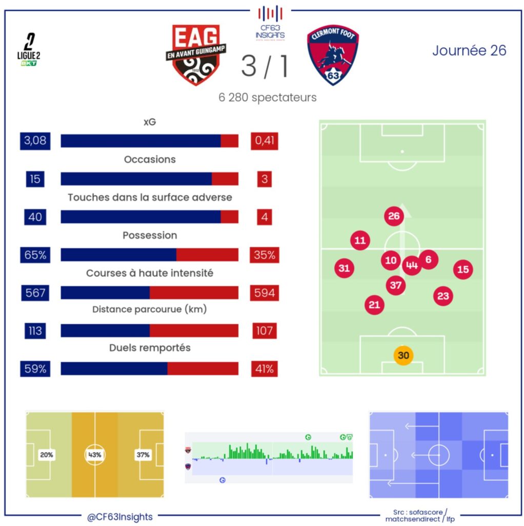 Les chiffres parlent d’eux-mêmes : 40 touches dans la surface adverse pour Guingamp contre seulement 4 pour Clermont, illustrant à quel point les Auvergnats ont été inoffensifs après leur but !