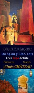 L’exposition s’intitule”Orientalisme”. Et le titre n’a rien d’étonnant tant Inès Château avoue sa passion pour les voyages et les cultures du monde et tant cette artiste peintre pastelliste transcrit sa fascination à travers ses toiles. Les grands maîtres orientalistes l’inspirent. Alors, elle développe un style figuratif et y inscrit des compositions structurées aux couleurs chatoyantes. Les couleurs, justement, éclatent, elles évoquent des contrées chaudes et bigarrées, des paysages harmonieux et exotiques.