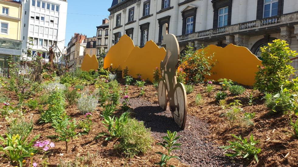 Comme chaque été, la métropole de Clermont a installé un jardin éphémère sur la partie nord de la place de Jaude. Plusieurs objectifs motivent cette installation annuelle. Il s’agit de créer à la fois un rafraîchissement naturel, une zone de convivialité pour profiter des beaux jours et la mise à l’honneur d’un événement. Nul ne sera donc étonné de découvrir cette année, une thématique sur le cyclisme puisque la métropole verra passer le peloton hommes du Tour de France, lors de l’étape du 14 juillet et que Clermont sera ville départ de la 6e étape du Tour femmes, le 31 juillet.