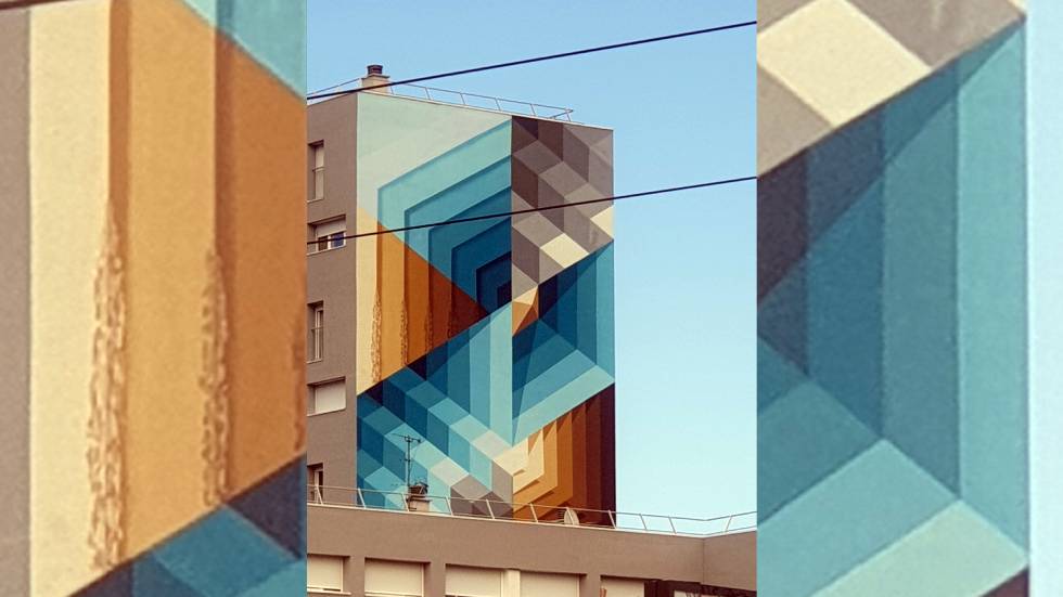 La marque de fabrique de Mr June, sa signature pour ainsi dire, ce sont des assemblages d’hexagones. L’œuvre située rue des Liondards, face à la rue Henri Pourrat, ne déroge pas à la règle. « À travers mes tableaux, j’explore cette forme hexagonale. J’expérimente toutes les possibilités qu’elle m’offre. » Sa méthode consiste ensuite à combiner divers éléments de ses anciennes « toiles » comme il les appelle, pour en créer une nouvelle. « Ce qui m’importe, c’est d’insérer au mieux l’œuvre dans son environnement de manière naturelle, comme si elle n’était qu’un élément d’un grand tableau. » L’inspiration lui vient en découvrant le mur qui va lui servir de support. « Il doit me parler. C’est difficile à expliquer, ça relève du ressenti. La première question que je me pose, c’est comment les gens vont découvrir la fresque ? Sous quel angle ? Seront-ils à pied ou en voiture ? La verront-ils de près ou de loin ? Dans un deuxième temps, je cherche les formes, les lignes, les couleurs. Ensuite, les questions sont d’ordre plus techniques : l’accessibilité, de quelle nature est le matériau sur lequel je vais peindre, etc. »