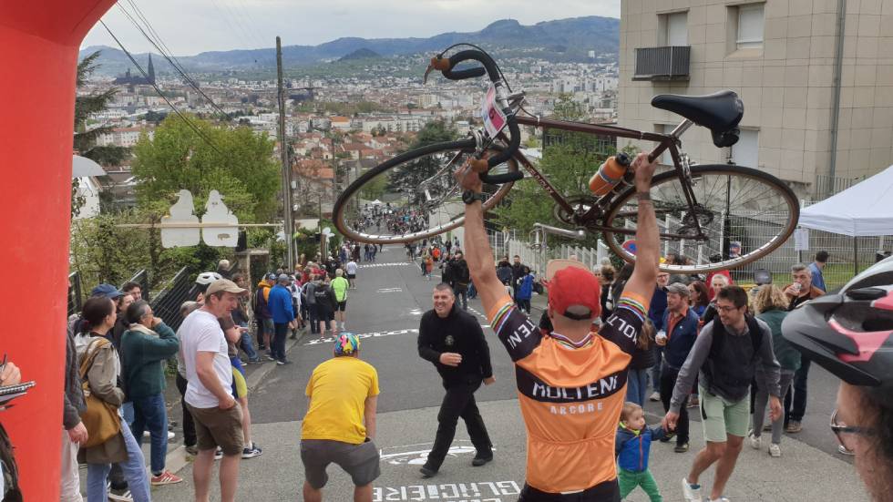 La Montée Infernale est, pour tous ceux qui s’y engagent, l’occasion d’être roi ou reine de la route, centre du monde le temps de la montée de la terrible rue du Docteur Hospital. Cette rue clermontoise qui ressemble à un toboggan affiche un dénivelé de 8 à 20%. Autant dire qu’arriver à son sommet est un défi pour chaque participant. En 2024, la première édition était ouverte à 100 cyclistes, une jauge remontée à 150 pour la seconde édition ce qui a permis de composer un conséquent “peloton” hétéroclite, avec beaucoup d’hommes, pas assez de femmes, de très jeunes participants et de nombreux pratiquants venus avant tout pour l’ambiance, même si pour certains, l’esprit de compétition demeurait. Et de l’ambiance il y en a eu. Jean-Paul 2 Roues, “Pape de la petite reine”, qui avait fait une apparition remarquée en 2024 est revenu cette année avec sa Papamobile. Il a béni de nombreux fidèles, mais il a surtout converti de nombreux participants au déguisement, offrant la possibilité de voir monter Obélix, Wonder Woman, ou Monsieur Cochonou. Côté public on a aussi joué le jeu pour encourager les grimpeurs dans une ambiance digne du fameux virage des Hollandais de la montée de l’Alpes d’Uez sur le Tour.