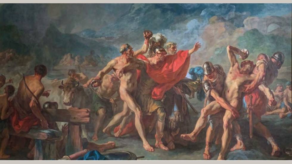 Le Combat d’Entelle et de Darès du peintre Louis-Jacques Durameau est une commande faite par le roi Louis XVI. Le tableau fut présenté au Salon en 1779 accompagné de quelques lignes que son auteur avait rédigé : dans les jeux funèbres qu’Énée fait célébrer en Sicile, chez le roi Alceste sur le tombeau d’Anchise, son père, ce héros, sépare ces deux athlètes et sauve Darès de la fureur du vieil Entelle. Dans cette grande composition de quasiment 4 m², Durameau illustre un passage tiré du livre V de l’Énéide de Virgile, grande épopée mythologique qui retrace le parcours d’Énée depuis la défaite de Troie jusqu’à son arrivée en Italie sept ans plus tard.