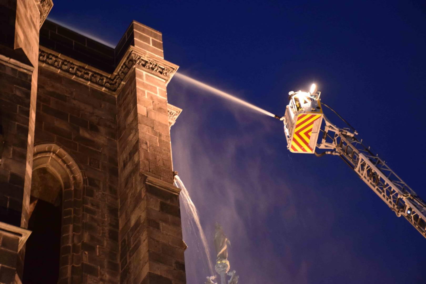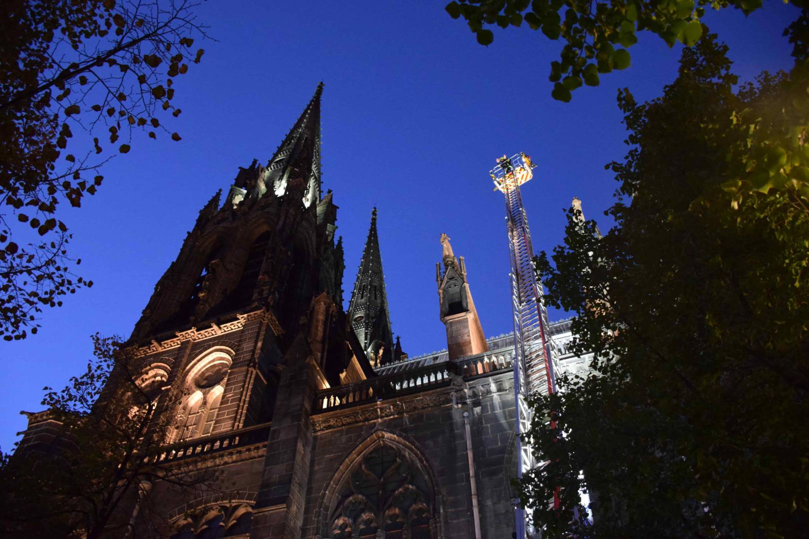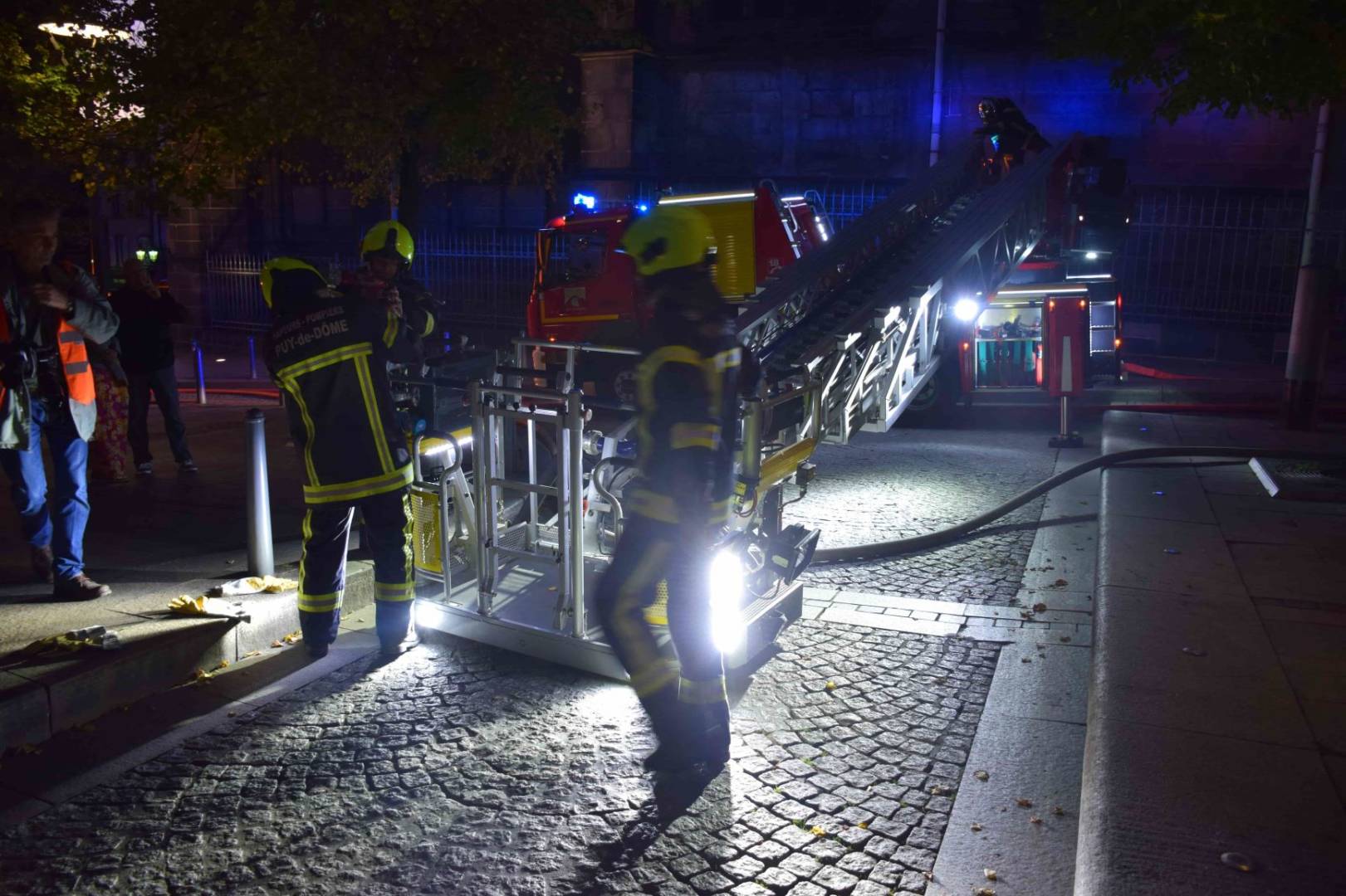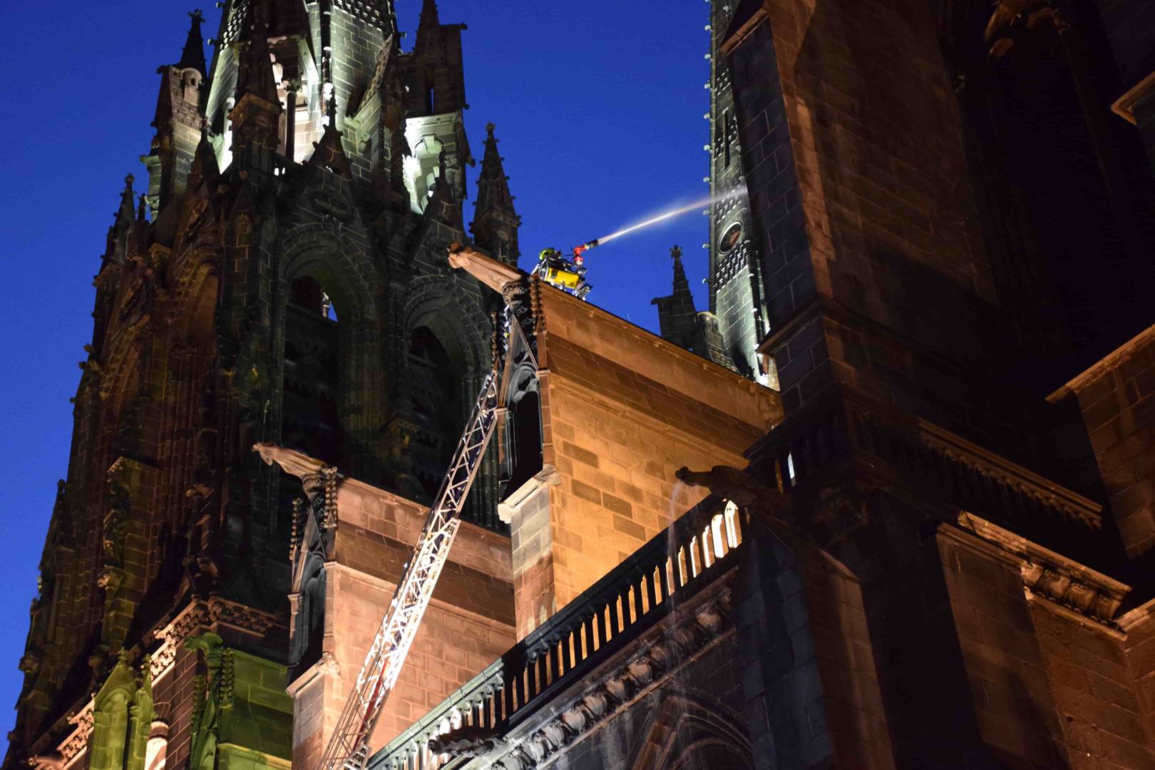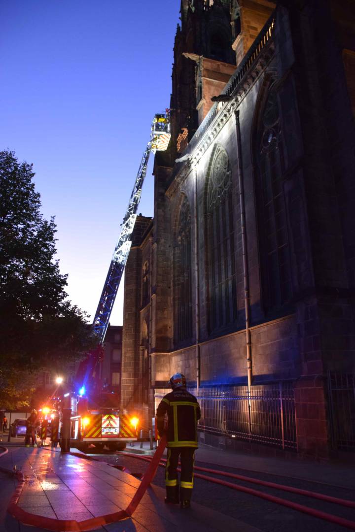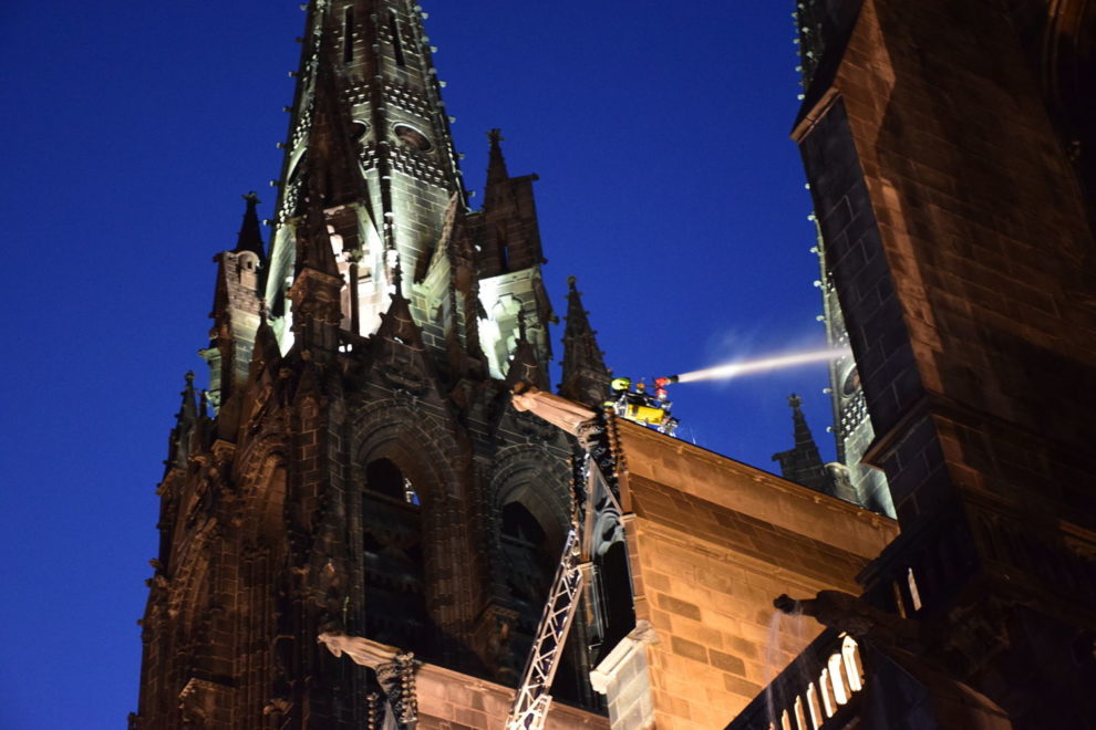 Les deux premiers camions arrivent plus tard que prévu, gênés par des véhicules mal stationnés sur les petites rues de la butte centrale. A 19h45, deux grandes échelles sont déployées. Tout se passe dans le calme. Aucune sirène n’est déclenchée. Sur leurs nacelles, alors que la nuit tombe, les soldats du feu arrosent un incendie invisible. Des trombes d’eau bien réelles se déversent sur le trottoir. “A Paris, il y a la Seine. A Clermont, l’accès à l’eau est plus compliqué” rappelle Christian Rodier. Pour atteindre les flammes, l’autre solution aurait été de monter sur la tour de la Bayette ou dans les flèches. Mais les escaliers sont particulièrement exigus… et plongés dans le noir. Pas facile de grimper là-haut avec tout le matériel.