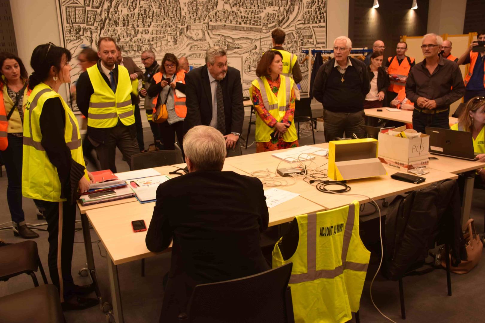 Au sein de la cellule de crise de l’Hôtel-de-Ville, chacun s’affaire à sa mission, sous l’œil attentif d’Olivier Bianchi et de son entourage. Cyril Cineux, son adjoint, est là aussi. Sur le chemin du retour, nous croisons des pompiers et des policiers qui emmènent en lieu sûr les œuvres patrimoniales “majeures”. Un plan de sauvegarde a été mis en place, en accord avec le Direction Régionale des Affaires Culturelles. Pour des raisons de sécurité, l’adresse de dépôt est tenue secrète.
