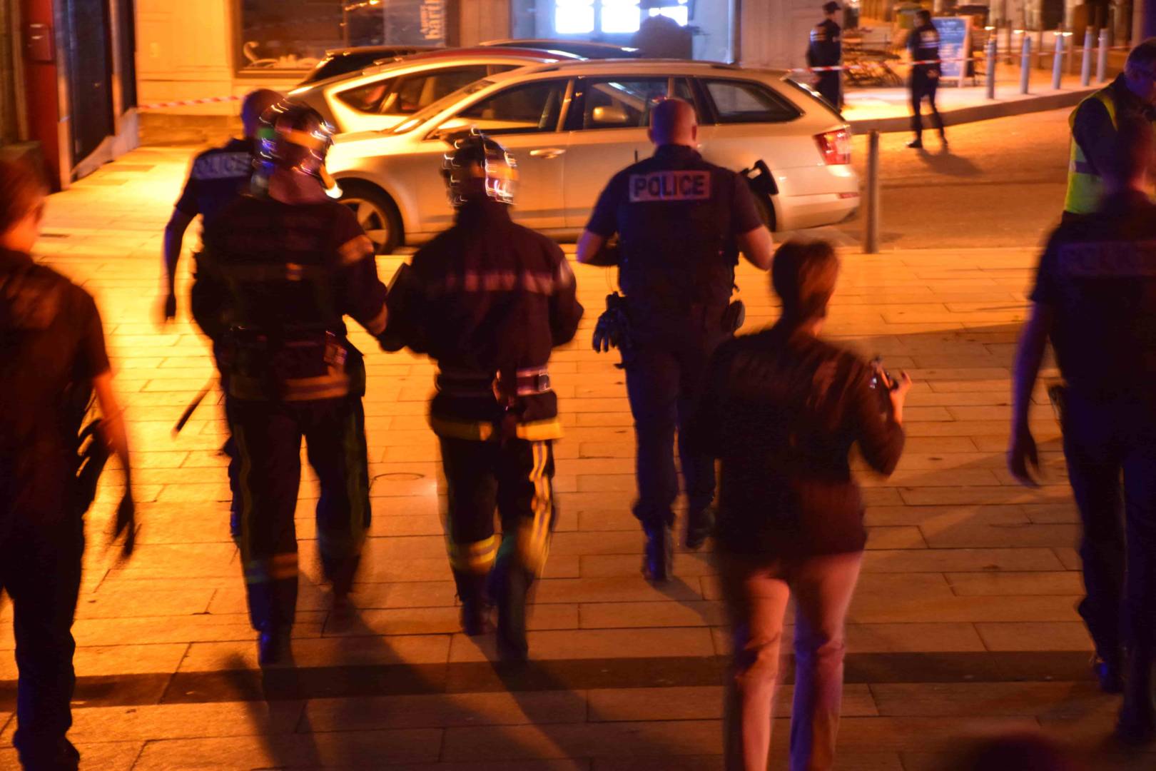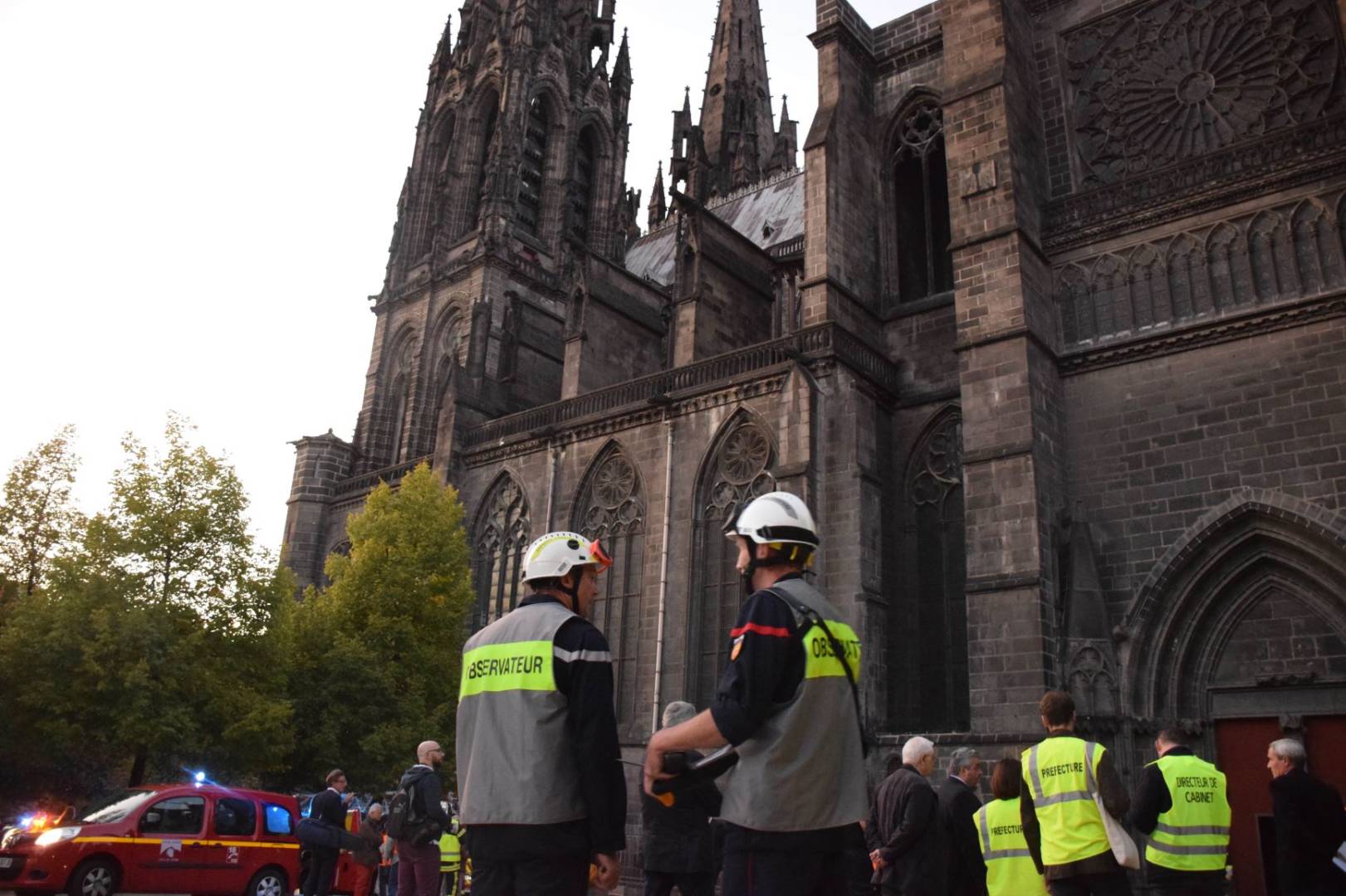 La vraie-fausse alerte a été donnée à 19h18. Des flammes, forcément invisibles, ont été aperçues sur la toiture, au-dessus de la rosace. Sur la place de la Victoire, la préfète Anne-Gaëlle Baudoin-Clerc et le maire Olivier Bianchi assistent aux opérations. A leurs côtés, de nombreux pompiers et policiers. Tout ce petit monde est affublé de gilets jaunes (les fameux) ou oranges (moins connotés.) Une dizaine de journalistes couvrent l’événement. Le secteur est bouclé. 37 engins sont prêts à intervenir…
