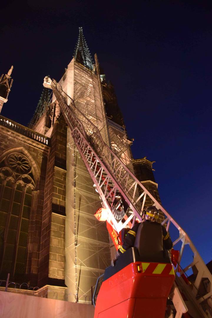 La fin de l’exercice prend fin autour de 21 heures. Globalement, tout s’est bien passé. “Nous sommes assez satisfaits. Une centaine de pompiers ont découvert cet édifice. Nous avons pu mettre en oeuvre un certain nombre de pratiques. Le bilan est donc très positif, même s’il reste des points à améliorer” conclut le lieutenant-colonel Christian Rodier. En haut de la tour Bayette, des pompiers profitent un instant de la vue imprenable sur la ville. La nuit est tombée. Les flèches de Notre-Dame sont intactes.
