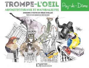 Les beaux livres consacrés au patrimoine bâti du Puy-de-Dôme, sont souvent traités de manière académique, parfois encyclopédique, toujours sérieusement. Il ne faut donc pas bouder son plaisir face à une nouveauté récemment éditée par les éditions de la Flandonnière. Trompe-l’oeil architecturaux et naturalistes dont Régis Guillot a signés textes et dessins, nous offre une vision du département qui interpelle et fait sourire. L’auteur s’est amusé à créer une centaine de duo bâtiment/animal qu’il appelle « Les Animonuments ». 12 grands thèmes, comme l’Art Roman ou Clermont et Michelin sont traités et chaque lieu ou bâtiment emblématique est associé à un animal familier ou exotique.
