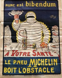 Le gros de la vente sera bien entendu consacré aux plus traditionnels objets Michelin. Le Guide rouge jouera les vedettes avec ses éditions les plus anciennes si recherchées et la collection du chef étoilé auvergnat Guy Legay qui dirigea les cuisines de Ledoyen et de l’hôtel Ritz. Pour les bourses plus modestes nombre de petits objets publicitaires ou utilitaires seront mis en ventes, enfin le “clou” de la vente sera sans conteste une affiche “Nunc Est Bibendum” de 1910 de grande dimension (160 x 120 cm), dans un état de conservation exceptionnel.