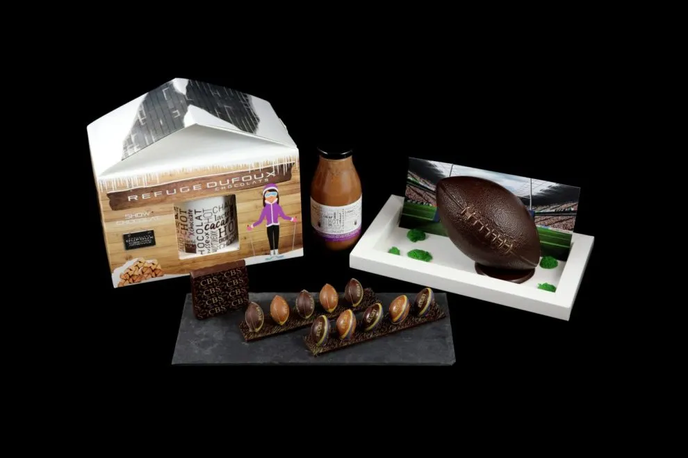 Immanquable au pays de l’Ovalie, où l’ASM est roi : le ballon de rugby constitué par un savoureux entourage en chocolat noir ou au lait et qui contient, en son intérieur, une série de petits ballons au chocolat (20€). A craquer : la réglette de petits ballons ovales au praliné noisettes et enrobage chocolat noir et au lait (7€). Adorable : le « refuge chocolat », un coffret en forme de chalet de montagne composé d’un chocolat chaud à faire revenir au fouet, d’une bouchée-chocolat ou d’une madeleine et d’un mug (17€). A découvrir également (et à offrir), la gamme de chocolats en vrac et les spécialités maison comme le Conquistador, un délice de praliné, pistache, noisette, orange confite, raisin flambé au rhum et chocolat. Tous les chocolats Dufoux sont fabriqués artisanalement à Charolles en Saône-et-Loire.