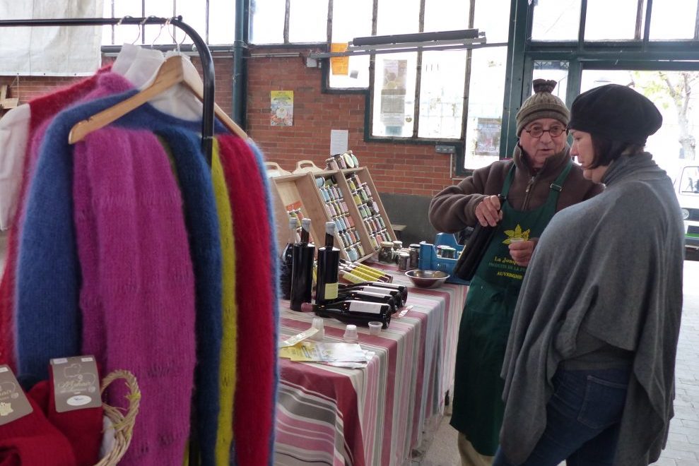 Ce jour-là, il y a Benoit Porteilla, paysan et cueilleur de plantes, Céline Pirard de la ferme du Crest qui propose des fromages et de la viande de chèvre, les maraîchers bio de la ferme du Chandalon, Yannick Goutille producteur de Saint-Nectaire du GAEC de la Pouzière, Marilyne Merle qui offre des pulls et autres produits en laine mohair, les GAEC Doudou et de l’Hermitage producteurs de fromages et autres produits laitiers, et la ferme Guy qui vend sa charcuterie. Ils font partie de la douzaine de producteurs et transformateurs fermiers qui a répondu à l’appel de La Jonquille pour investir la halle Saint-Joseph le samedi matin. Créée en 1991, cette association en regroupe une soixantaine, tous auvergnats, bio ou en agriculture raisonnée, et organise le marché historiquement le vendredi matin dans ce bâtiment classé.