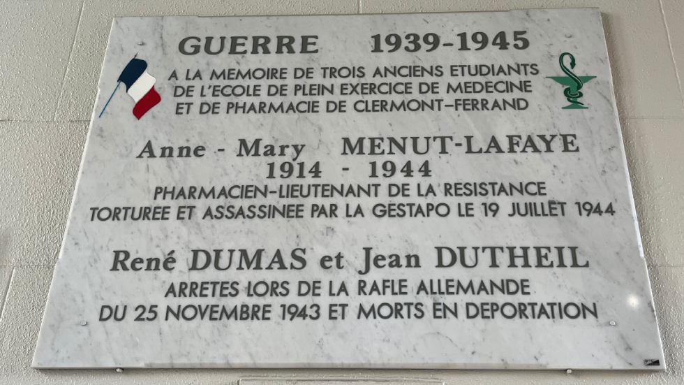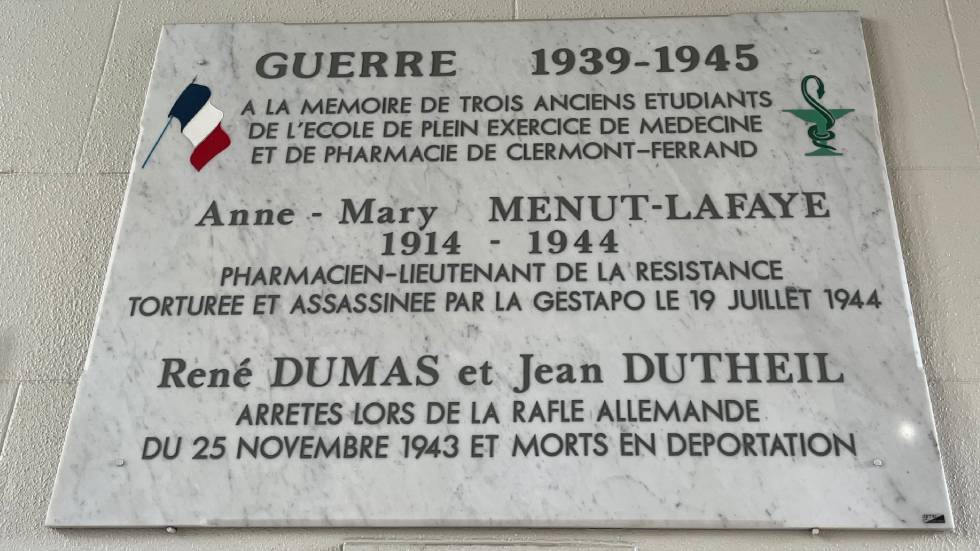 Née le 16 mai 1914, Marinette Menut est diplômée de la faculté de pharmacie en mai 1939. Elle s’est mariée à Max Menut, avec qui elle a créé « la Pharmacie Nouvelle », place Doumer à Riom. Le couple Menut s’est engagé rapidement dans la lutte contre l’occupant nazi. D’abord soutien moral, elle s’engage au côté de son mari en novembre 1942 pour des opérations clandestines : transports de médicaments, distribution de journaux, missions de ravitaillement,…. Dénoncée, la femme lieutenant est donc arrêtée par la Gestapo en juin 1944 à Saint-Just (Cantal). Elle est par la suite, amenée à Chaudes-Aigues. Puis elle est hospitalisée à Saint-Flour dans un dispensaire d’où elle tente de fuir. Marinette Menut est finalement transférée à Clermont, où elle a été torturée à mort en juillet 1944. Son corps est découvert, fin 1944, dans une fosse commune sur le terrain d’aviation d’Aulnat.