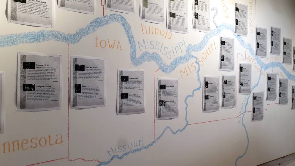 Le projet a pris corps dans une des salles de l’Hôtel Fontfreyde, centre photographique à Clermont sous forme d’une immense cartographie murale du Mississippi sur laquelle des textes courts rédigés par les élèves, sont appliqués à l’emplacement de villes étapes qui ont accueilli l’auteur et où sont nés des musiciens immortalisés par le photographe. Les élèves ont pris le parti d’imaginer des monologues intérieurs ou des saynètes, inspirés d’une sélection de 72 photos diffusées en boucle sur un grand écran. Pourquoi 72 ? tout simplement pour 36 éditions de Jazz en Tête X 2 descentes de Mississippi.