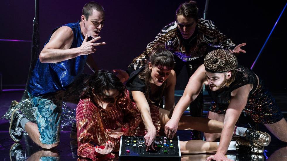 De la période underground, puis celle des “pousseur de disques” sur les radio FM, jusqu’à l’avènement des pop-stars de festivals, la figure du DJ n’a cessé d’évoluer au fil du temps. Elle offre aujourd’hui différentes postures, mais tous ces “platineurs” partagent une même passion, celle d’avoir la capacité de faire bouger les pieds et d’exalter les foules. Pourtant face au bouillonnement du dancefloor, les DJs, peuvent sembler bien statiques et contraints, à l’inverse des musiciens libres de leurs allers et venues sur l’espace scénique. Ils sont quasi reclus derrière leur matériel, dans les quelques mètres carrés qui leurs sont impartis. Le spectacle MuTE “propose d’activer le mode « mute » de nos projections pour en inverser le rapport” et Bérénice Legrand offre une vision humaine de ces personnages moitié homme, moitié machine, avec 5 performeurs qui déploient une “chorégraphique euphorisante au cœur d’un dispositif sonore et technologique dont ils sont aux commandes”. L’image du DJ solo, souvent celle d’un homme d’ailleurs, vole alors en éclat et l’attention se fixe sur les 5 corps qui sont devenus des objets scéniques.