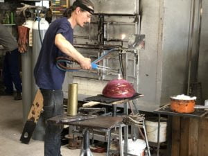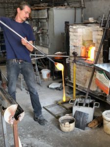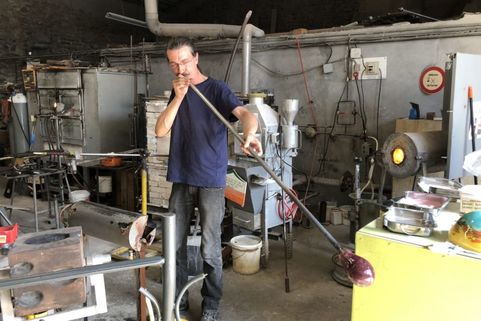 Cheveux attachés et bouc à la D’Artagnan, Nicolas Diverchy dispense de précieux conseils à son apprenti. Dans une atmosphère surchauffée par les fours, les bruits caractéristiques de ses outils attirent l’attention des personnes venues découvrir son activité et le voir réaliser une lampe. Créer, apprendre et transmettre sont les moteurs qui rythment le quotidien de son atelier de verrerie.