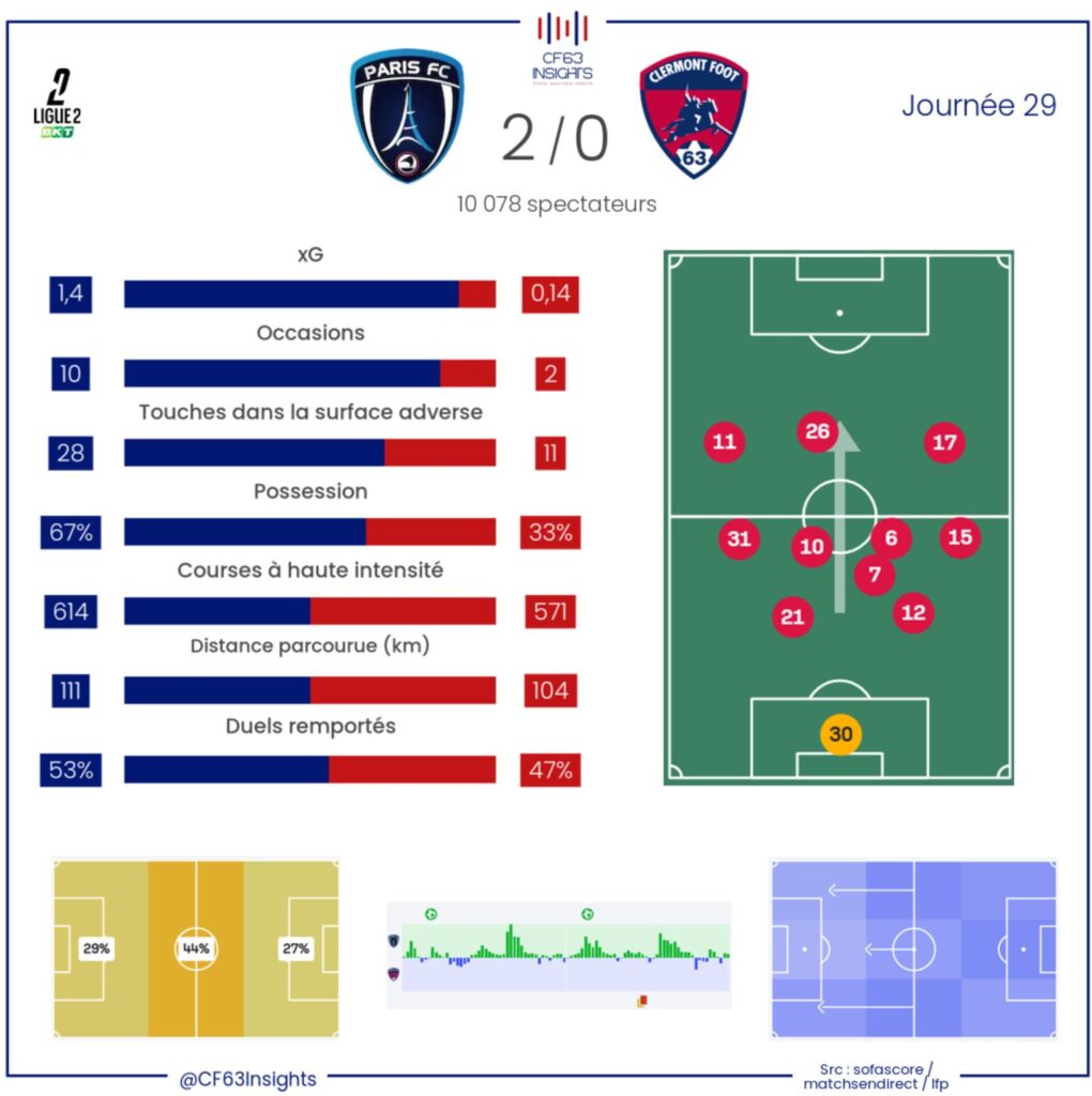 Mbow a doublé la mise à la 51e minute, profitant d’une nouvelle erreur de positionnement clermontoise. Paris a dominé dans tous les secteurs : 10 occasions créées contre seulement 2 pour Clermont, 28 touches dans la surface adverse contre 11 côté CF63, 1,4 xG pour les locaux contre 0,14 pour les visiteurs.