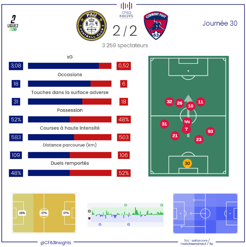 Car, avec un xG famélique de 0,52 contre 3,08 pour les Palois, Clermont a affiché de nouveau ses failles défensives béantes et sa faiblesse offensive en dépit d’un réalisme retrouvé.