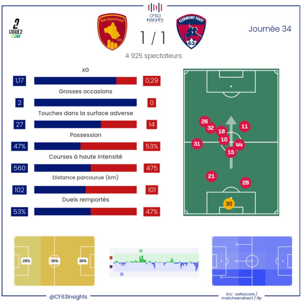Sur le plan statistique, Clermont a davantage tenu le ballon (53 % de possession), mais a cruellement manqué de présence offensive pour créer du danger, ce qui se retrouve dans les chiffres : 0, 29 en xG, 0 grosse occasion, seulement 4 centres réussis sur 25 tentés.