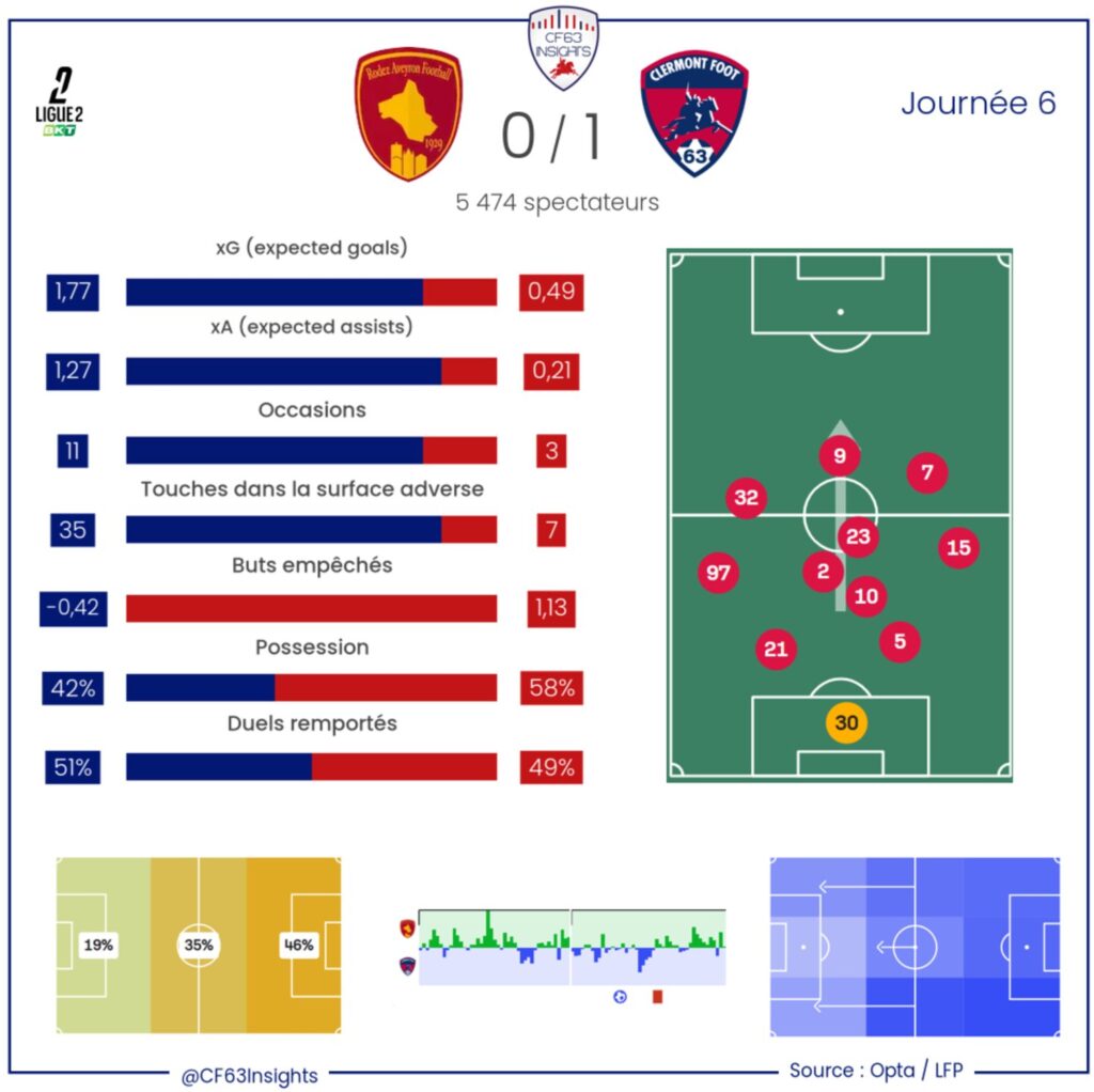 Avec 1,77 xG à 0,49 pour Rodez, 11 occasions à 3, et 35 touches ruthénoises dans la surface adverse contre 7 pour les auvergnats malgré une possession de 58%, les statistiques traduisent un scénario bien connu côté CF63 : une équipe qui joue sur un faux rythme, sans mordant, ralentit à chaque fois qu’une accélération semble possible et qui semble chercher à « gérer » la rencontre dès le coup d’envoi.