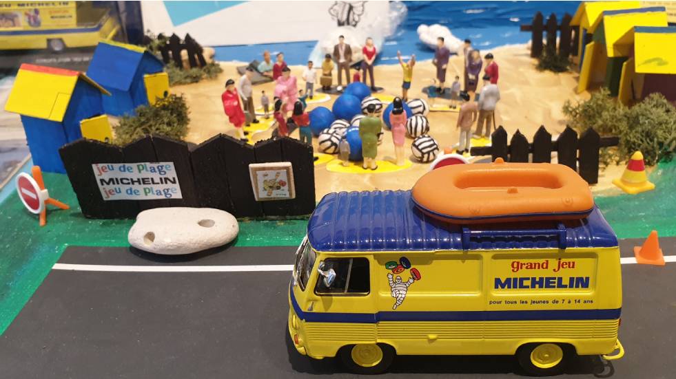 Durant la décennie 1970, Michelin a produit des nombreux jeux de plage destinés à occuper les plus jeunes durant les longues journées marquées par le gras de l’Ambre Solaire et des Chichis. Le manufacturier clermontois avait bien compris que, sur le sable chaud, il était facile de capter l’attention des vacanciers en fournissant aux plus jeunes des bouées, des ballons, des raquettes, des sacs, des jeux de cartes et des gadgets qui ne s’appelaient pas encore goodies. Personnage clé d’opérations façon Club Mickey, le Bib était présent pour animer des plages situées essentiellement en Bretagne et sur la côte Atlantique et rappeler aux parents que le pneu XAS était le meilleur choix pour les 404 et les DS. De cette période révolue, restent un certains nombres d’objets devenus de collection qui revivent le temps d’expositions.