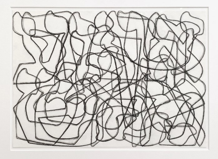 T.M : Non, il faut creuser et il faut demander où sont les textes qui ont été à l’origine de ce parcours parce qu’en fait il s’agit de lettres. Toutes les lettres du poème sont dessinées, mais comme le papier est petit par rapport à la taille des lettres, je reviens et ce sont des couches de lettres qui viennent petit à petit et qui créent l’ensemble d’enchevêtrement. C’est très difficile de voir ces lettres car on a pas l’habitude de les voir. Si cela avait été des lettres latines on en aurait repéré quelques unes.