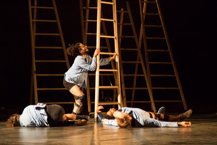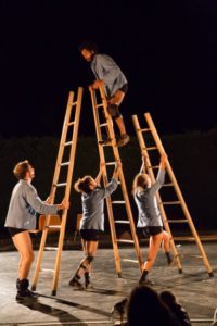 Bien-sûr, c’est un ustensile, un objet ô combien pratique à partir duquel l’individu s’élève mais dont on peut aussi tomber et se faire mal. Mais l’échelle est aussi hautement symbolique de notre société, qu’elle soit sociale, hiérarchique ou des valeurs. En réalité, elle est au cœur de notre société. La compagnie La Tournoyante en a saisi l’ensemble des dimensions et elle a choisi de jouer avec elle. Munis de simples échelles de bois, quatre acrobates élaborent des jeux de construction d’où émerge un théâtre de nos rapports de force. Ils montent, tombent et se relèvent, se propulsent ou s’effondrent, se piétinent ou s’entraident. Un mouvement perpétuel, symptomatique du quotidien.